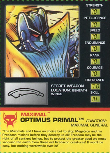 Optimus Primal is the leader of the Maximals and the captain of the spaceship Axalon, His beast mode is a Gorilla. He had a rivalry with the Predacon commander, Megatron. He was named after the Autobot leader, Optimus Prime. He was a Transmetal then he was known as Optimal Optimus, making him a Giant Ape.